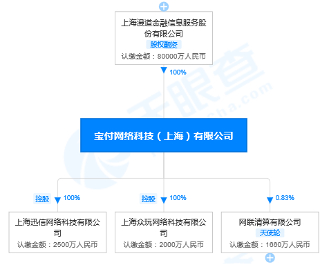 天眼查显示,宝付网络为上海漫道金融信息服务股份有限公司(下称“漫道金服”)的全资子公司。宝付网络设有上海迅信网络科技有限公司、上海众玩网络科技有限公司两家控股子公司。此外,宝付网络还参股了网联清算有限公司。