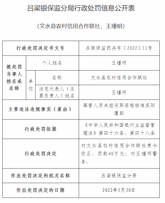 另一则行政处罚信息公开表显示,因高管人员未经任职资格核准实际履职,根据《中华人民共和国银行业监督管理法》第四十六条、第四十八条规定,文水县农村信用合作联社被予以责令改正,罚款40万元的行政处罚;对上述违法行为负有责任的王瑾明被予以警告的行政处罚。