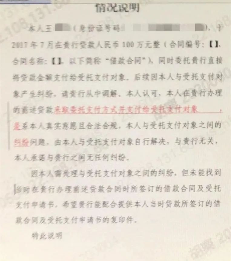 李文因上述贷款征信已逾期40多次,无法办理贷款、信用卡等。看到合同及银行流水后,李文多次与银行沟通,希望妥善处理此事。但银行仅让李文签署一份“情况说明”,该说明中提到,“本人认可,本人在贵行办理的前述贷款采取委托支付方式并支付给受托支付对象,是系本人真实意愿且合法合规……”。