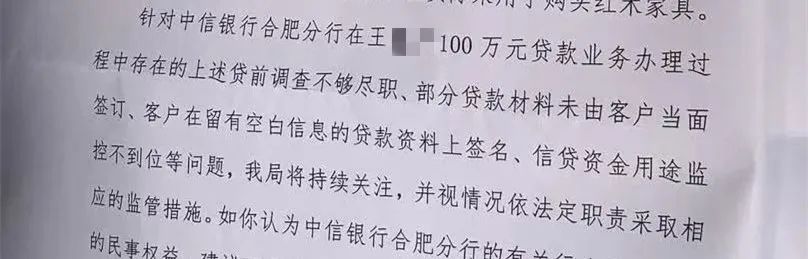 根据银保监会安徽监管局的调查,中信银行合肥分行在李文100万元贷款业务办理过程中,亦存在贷前调查不够尽职、部分贷款材料未由客户当面签订、客户在留有空白信息的贷款资料上签名、信贷资金用途管控不到位等问题。